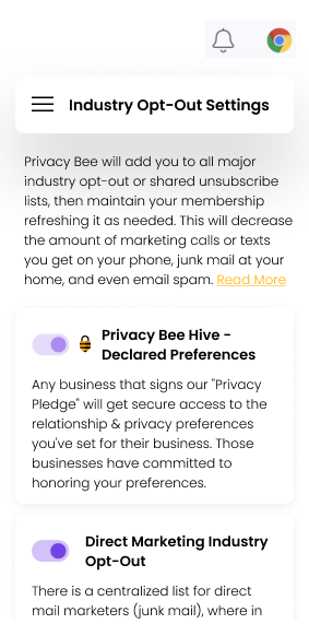Privacy Bee monitors every major industry marketing opt-out and shared unsubscribe list, with details on the last time we submitted you for exclusion. This substantially lessens the number of marketing departments who hold your contact data, de-risking your privacy.